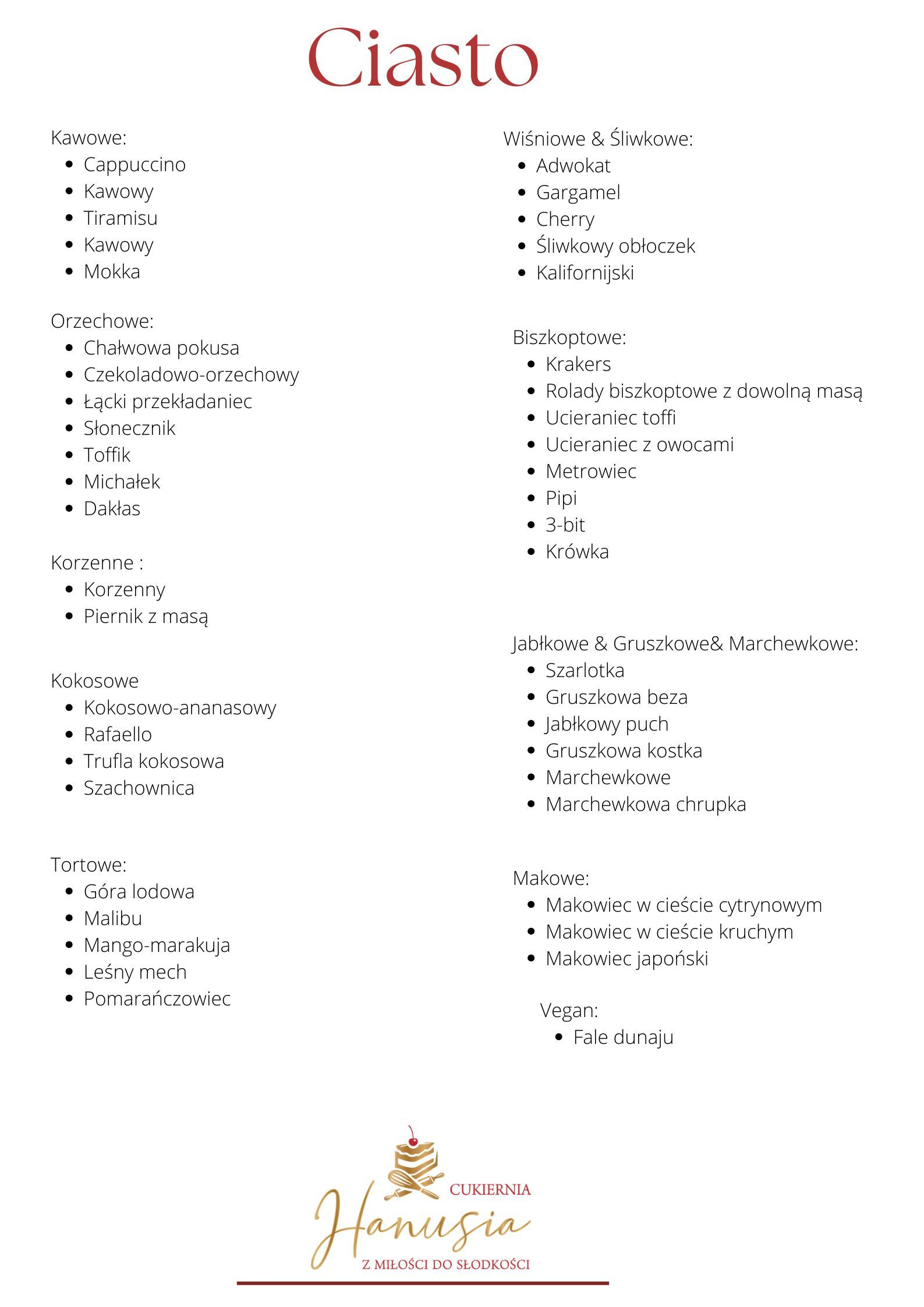 W naszej ofercie znajdziesz zarówno klasyczne ciasta, takie jak sernik, szarlotka czy makowiec, jak i bardziej wyszukane propozycje — torty czekoladowe, ciasta z musem owocowym, bezy, czy wypieki sezonowe inspirowane porami roku. Bez względu na okazję, nasze ciasta są idealnym dopełnieniem każdej chwili.